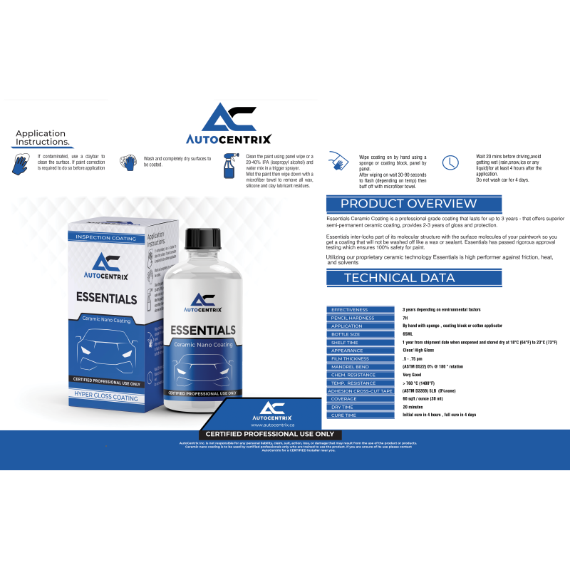 AutoCentrix Essentials Ceramic Coating is a professional grade coating that lasts for up to 3 years - offering superior protection from chemical etching due to environmental impacts. Essentials imparts an outstanding gloss, and protects your paint from everyday contamination through its tough chemical resistance and release properties.